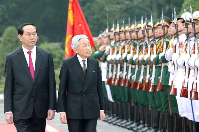 Chủ tịch nước Trần Đại Quang và Nhật hoàng Akihito duyệt đội danh dự tại lễ đón chính thức ở Phủ Chủ tịch.
