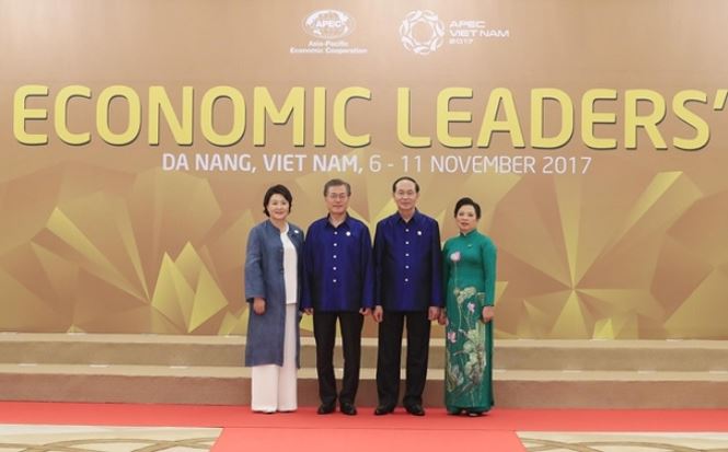 Chủ tịch nước và phu nhân đón Tổng thống Hàn Quốc Moon Jae-in và phu nhân đến dự tiệc chiêu đãi ngày 10-11-2017 trong khuôn khổ Tuần lễ cấp cao APEC ở Đà Nẵng.
