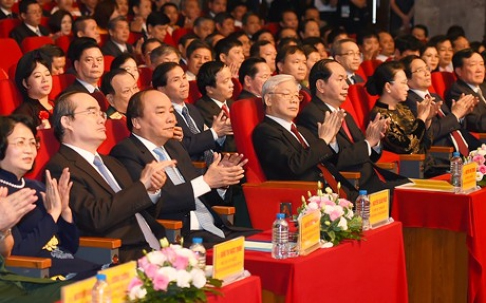 Lãnh đạo Đảng, Nhà nước và các đại biểu dự lễ tuyên dương điển hình tiên tiến. (Nguồn: VGP)