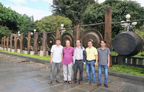 Tác giả và đoàn công tác chụp ảnh lưu niệm trước bộ cồng chiêng bằng đồng lớn nhất Việt Nam.