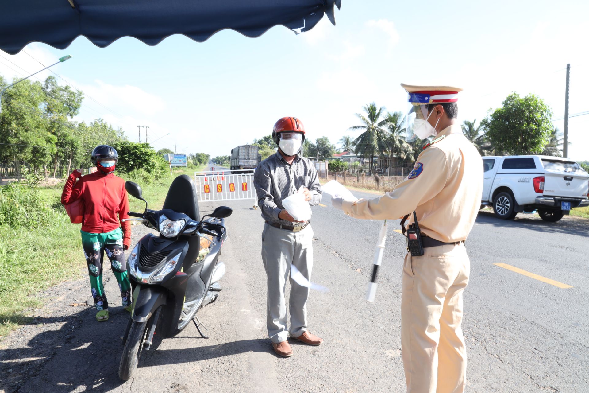 Cảnh sát giao thông kiểm tra giấy tờ người dân ra đường.