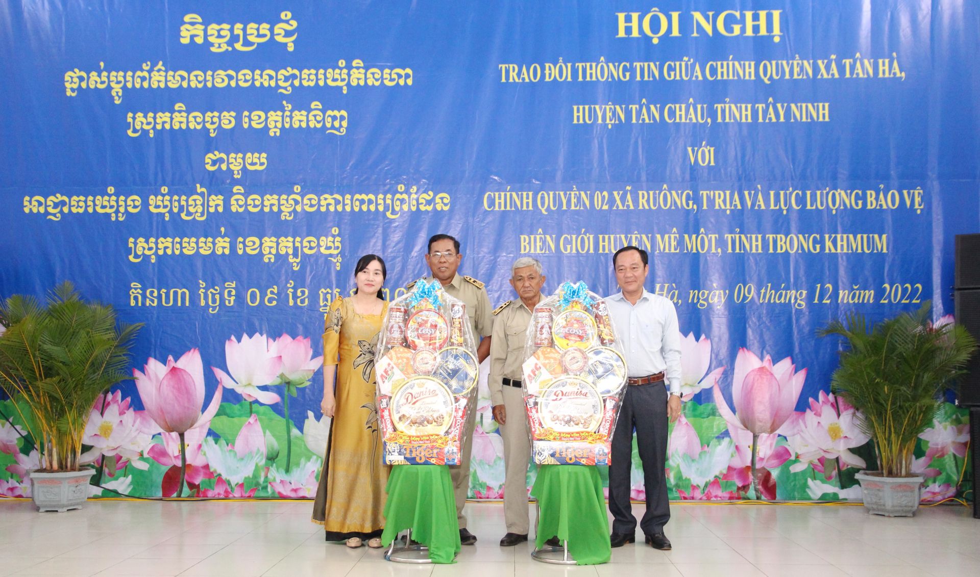 Lãnh đạo xã Tân Hà (huyện Tân Châu) tặng quà cho lãnh đạo xã Ruông và T’Ria (huyện Mê Mốt, tỉnh Tboung Khmum, Campuchia) tại hội nghị trao đổi thông tin giữa các xã.