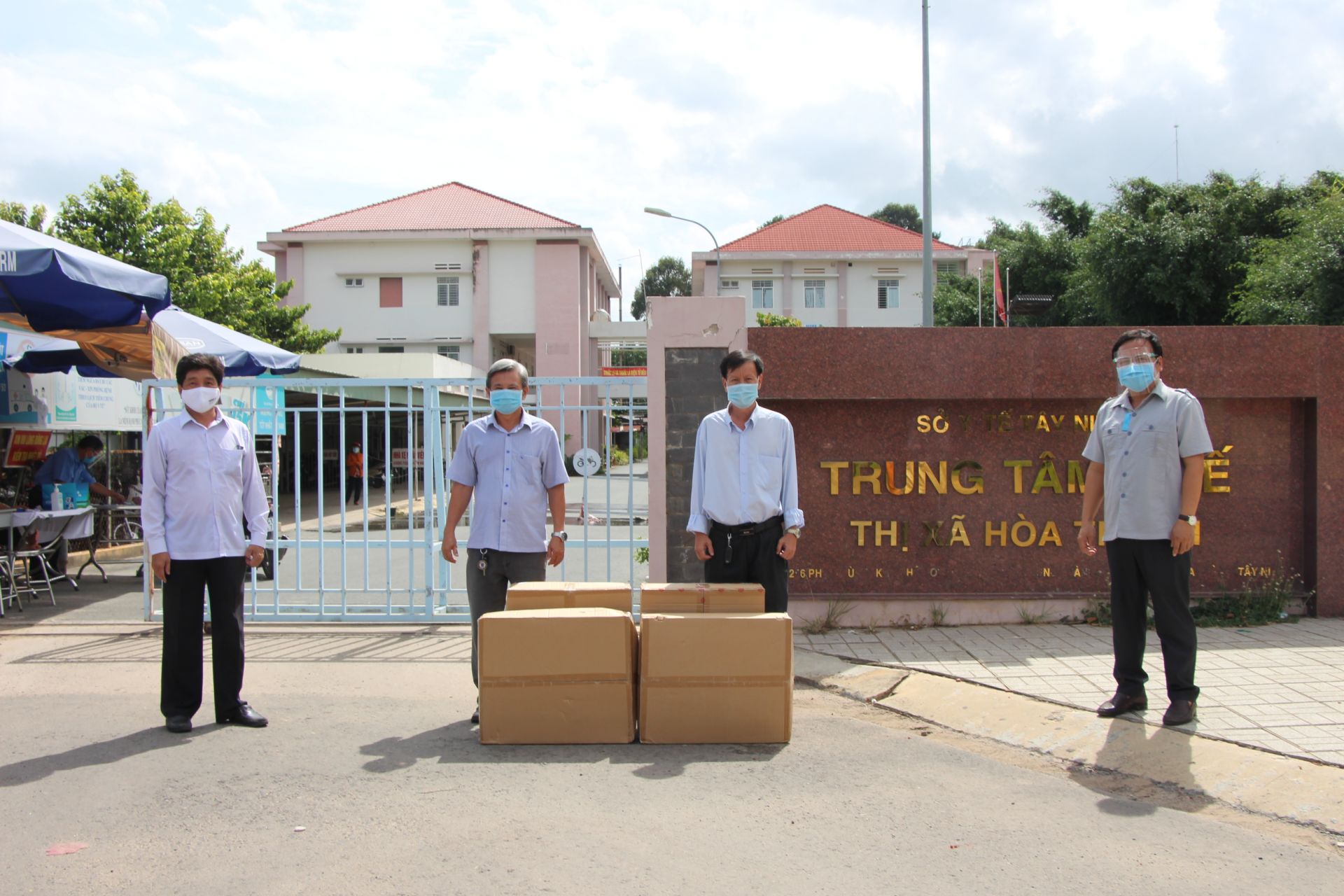 Phó Chủ tịch Uỷ ban MTTQ Việt Nam tỉnh Hồ Đức Hải (ngoài cùng bên phải) trao khẩu trang và tiền mặt cho Trung tâm Y tế thị xã Hoà Thành và Bệnh viện Đa khoa tư nhân Cao Văn Chí