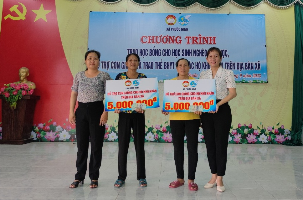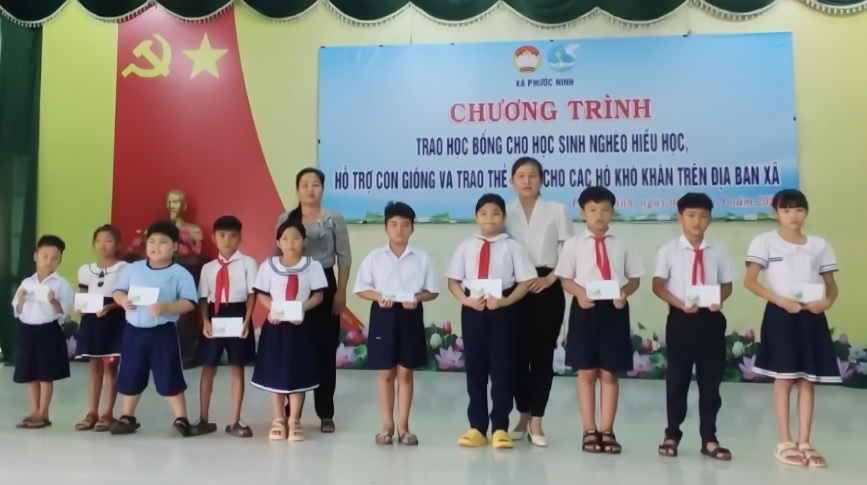 Tại đây, Uỷ ban MTTQVN xã trao 10 suất học bổng (mỗi suất 1.000.000 đồng), hỗ trợ con giống cho 2 hộ (5.000.000 đồng/hộ); hỗ trợ 200 thẻ BHYT cho các hộ khó khăn, trị giá 40 triệu đồng.