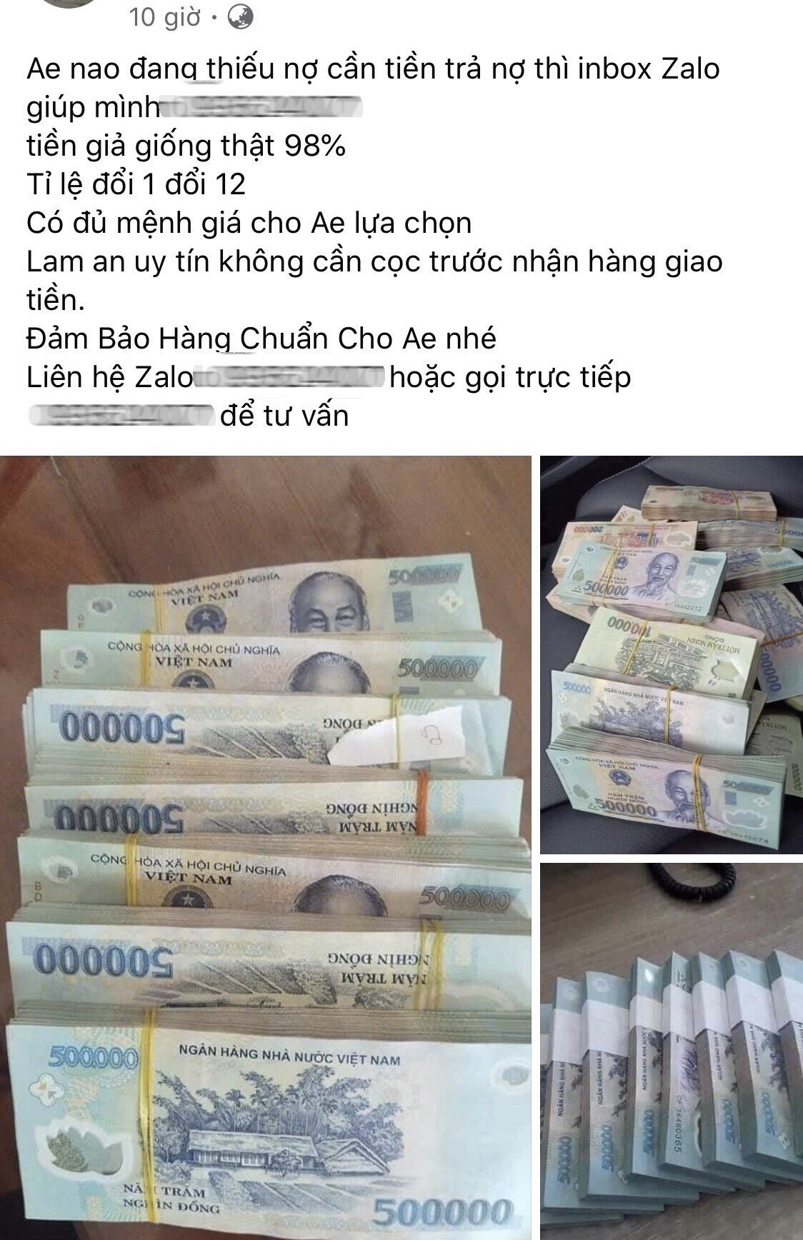Theo một tài khoản facebook có tên “Tuyet Xu” công khai rao bán tiền giả, thu hút sự quan tâm của nhiều người. Chủ tài khoản này đăng bài quảng cáo với nội dung “Anh em nào đang thiếu nợ cần tiền trả thì nhắn tin vào zalo thông qua số điện thoại 0936...071, cam kết tiền giả giống thật 98%, tỷ lệ đổi 1:12, với đủ mệnh giá và không cần đặt cọc mà nhận hàng rồi thanh toán...”.,