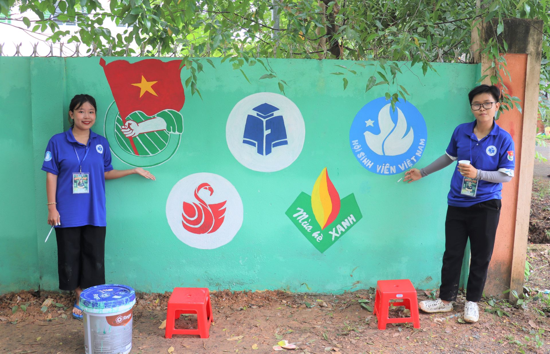 Chiến sĩ tình nguyện trường Đại học Công thương TP.HCM vẽ tranh bích họa tặng học sinh trường Tiểu học Long Chữ.