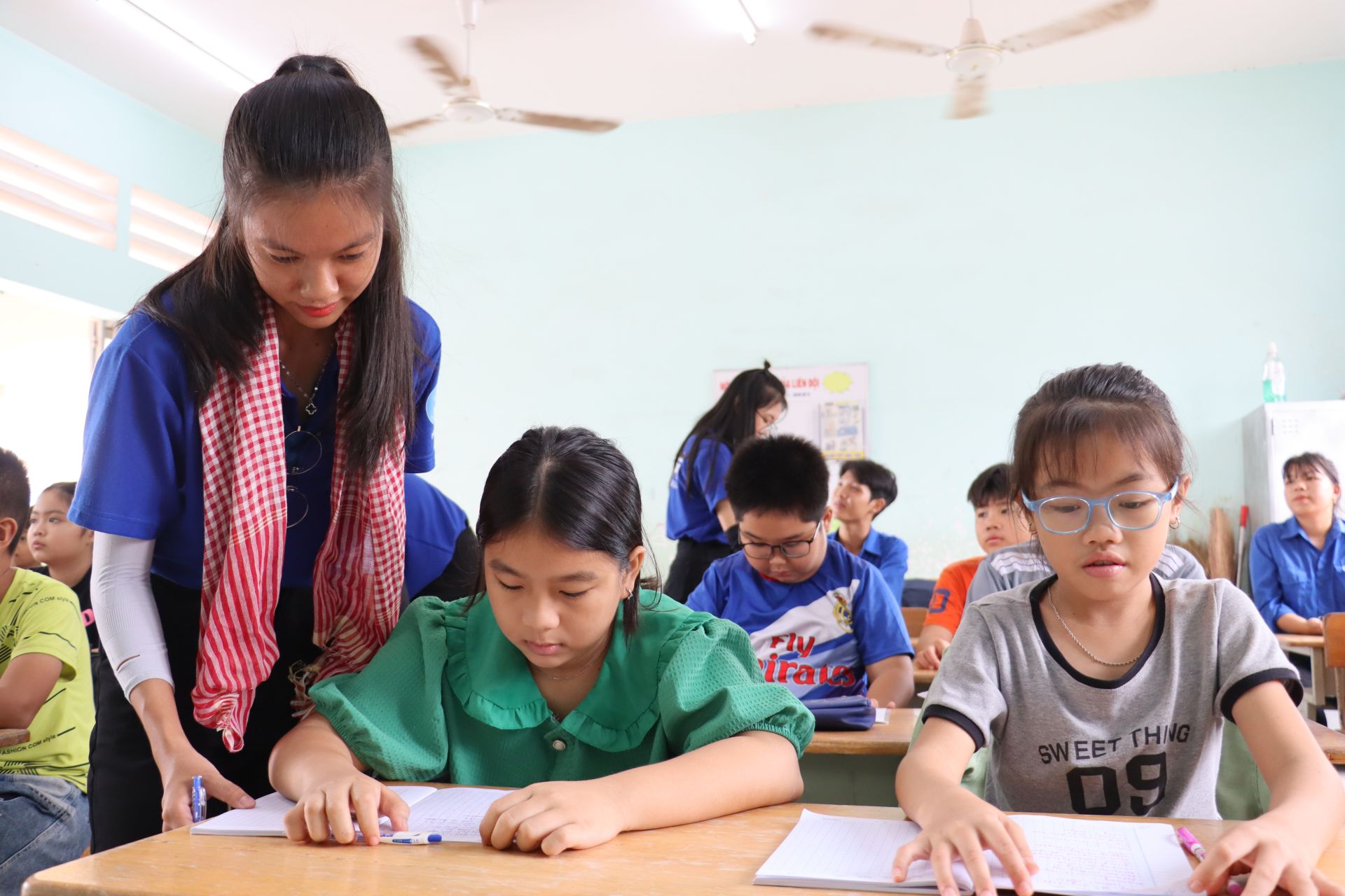 Chiến sĩ tình nguyện trường Đại học Ngoại ngữ - Tin học TP.HCM dạy kèm tiếng Anh miễn phí cho các em học sinh.