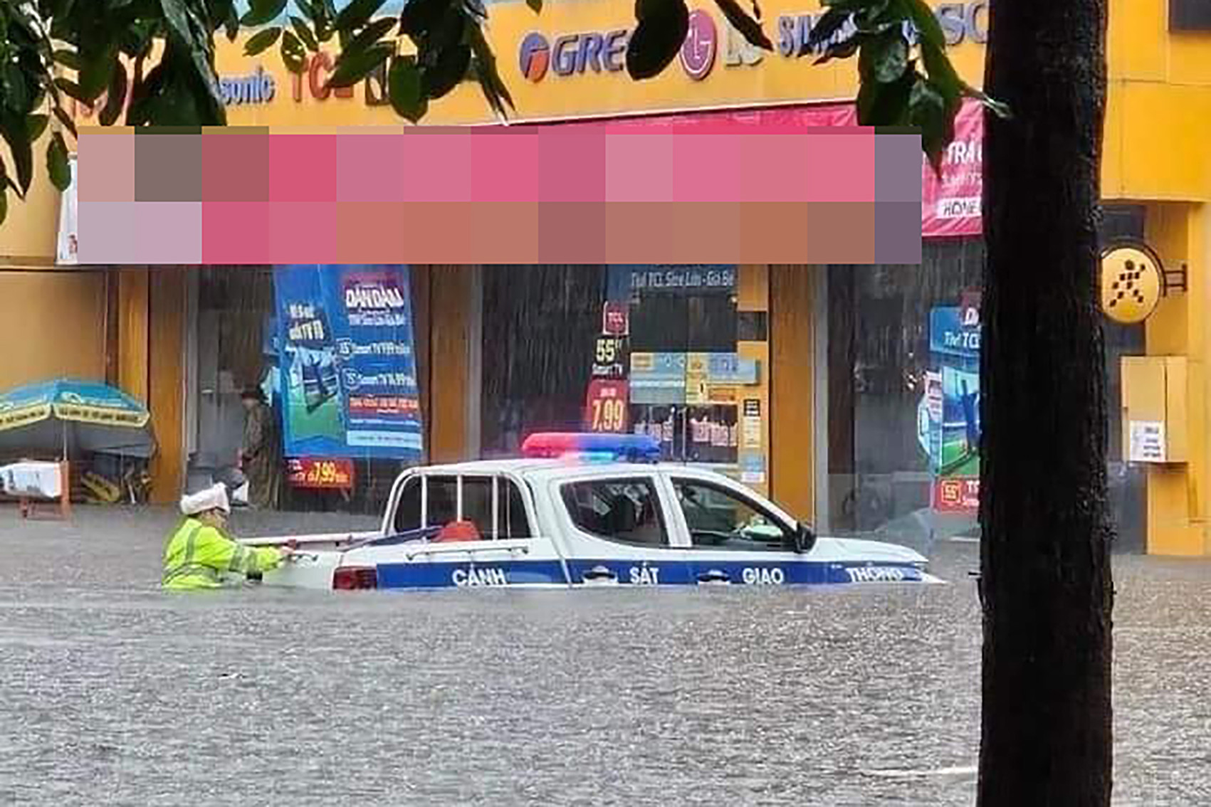 Ô tô của lực lượng CSGT cũng bị ngập gần tới kính xe. Ảnh: Q.M.G