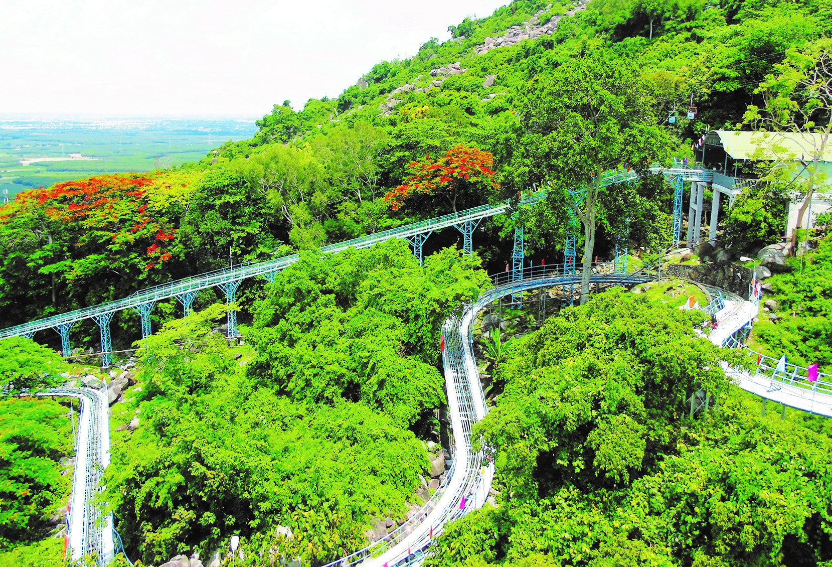 Ô kìa, trên một đoạn máng trượt thẳng băng, là ba chiếc xe trượt đang lao vun vút. Các bạn chắc vui sướng lắm, vừa trôi giữa màu xanh hoang hoải đại ngàn, vừa thoải mái la hét khi chưa kịp thắng khi tới một khúc quanh. Còn tôi lại thấy các bạn đang trôi giữa bồng bềnh hoa phượng. Và đôi khi để nhấn thêm màu đỏ thắm loang loang là những tàn cây rực rỡ những hoa vàng.