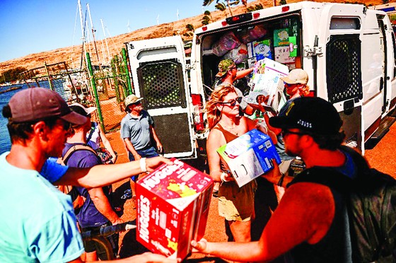 Nhân viên tình nguyện chuyển hàng cứu trợ người dân bị mất nhà cửa trong thảm họa cháy rừng ở Hawaii.