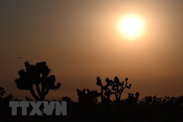 Hoàng hôn ở Lancaster, California (Mỹ) khi nhiệt độ lên tới 41,6 độ C, ngày 12/7/2021. (Ảnh: AFP/TTXVN)