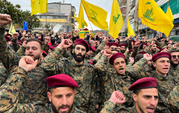 Các chiến binh và những người ủng hộ Hezbollah tham dự lễ tang của Ali al-Debs, một trong những chỉ huy của nhóm thiệt mạng bởi cuộc không kích của Israel hai ngày trước đó, tại thành phố Nabatieh phía nam Liban vào ngày 16/2/2024. Ảnh: AFP