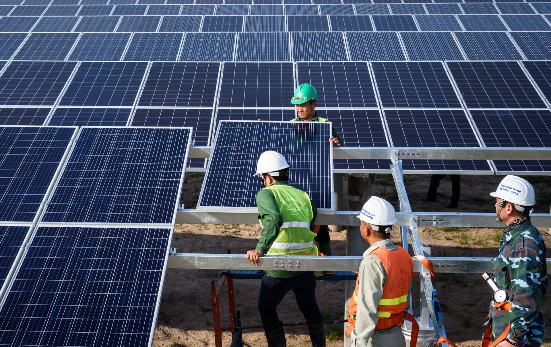 Lắp đặt panel pin năng lượng mặt trời tại Nhà máy Điện mặt trời Dầu Tiếng. Ảnh: Dương Đức Kiên