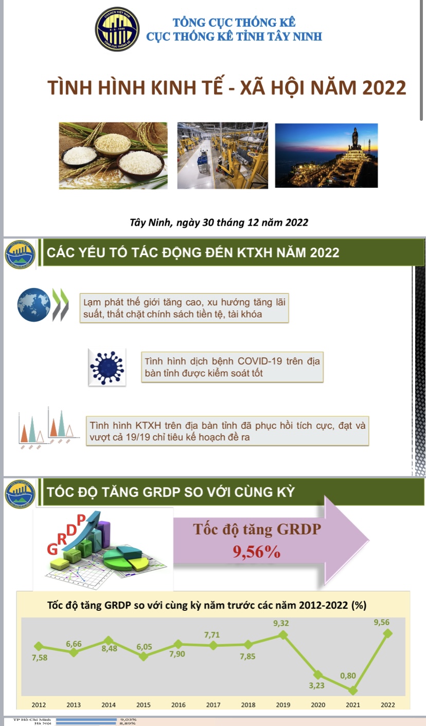 Tại buổi họp báo công bố số liệu thống kê kinh tế - xã hội tỉnh Tây Ninh năm 2022 diễn ra hôm 30.12.2022, ông Nguyễn Đình Bữu Quang – Cục trưởng Cục Thống kê cho biết, năm 2022, trong bối cảnh kinh tế gặp nhiều khó khăn, thách thức, nhưng dưới sự chỉ đạo quyết liệt của lãnh đạo địa phương, với chính sách phù hợp, linh hoạt, khách du lịch quốc tế dần quay trở lại, khu vực dịch vụ phục hồi mạnh mẽ, tình hình kinh tế - xã hội có nhiều chuyển biến tích cực, sản xuất công nghiệp tăng trưởng khá; hoạt động thương mại khởi sắc; đời sống vật chất của người dân được nâng cao; an sinh xã hội được bảo đảm.