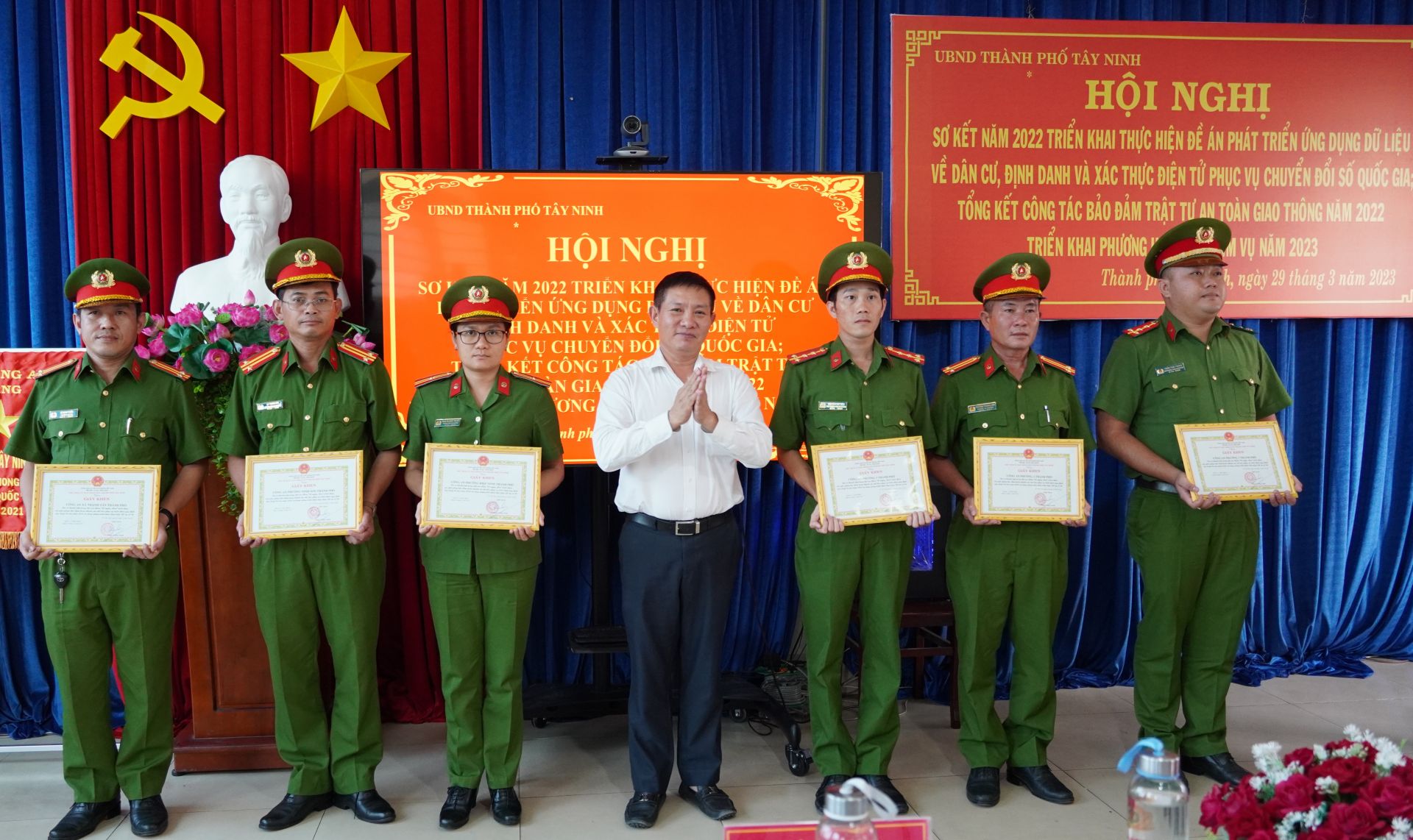 Ông Phạm Trung Chánh- Chủ tịch UBND Thành phố trao giấy khen cho các tập thể có thành tích trong thực hiện Đề án 06.