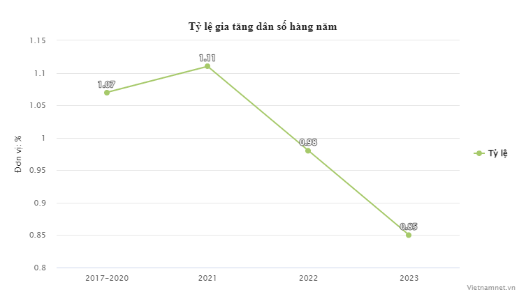 Dân số Việt Nam hết năm 2023 đạt khoảng 100,3 triệu người, tăng gần 835.000 người so với năm 2022, tương đương tăng 0,85%, thấp hơn mức 0,98% của năm 2022. Theo Tổng cục Thống kê, tỷ lệ tăng dân số của Việt Nam có xu hướng giảm dần trong những năm gần đây và dự báo tiếp tục giảm trong những năm tiếp theo.