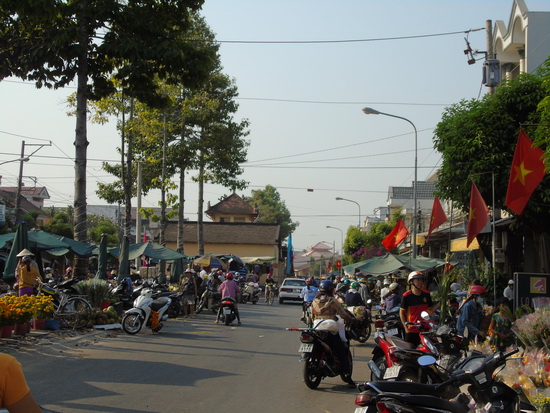 Đi về phía Nam. Cứ tưởng quốc lộ 22B ngày nghỉ tết đầu tiên sẽ rất đông người. Nhưng không! Dường như người đã kéo về hết từ đêm qua, để sớm nay còn rủ nhau đi chợ tết. Tôi định kiếm một cái chợ quê nho nhỏ mà không thể có, vì ngày cuối năm chợ nhỏ cũng thành to. Nào Long Yên, Cẩm Giang, Thạnh Đức, Hiệp Thạnh, Phước Trạch, chợ nào cũng tràn ra lề quốc lộ. Bát ngát và nồng ấm hương hoa. Nhiều nhất là cúc và vạn thọ; sau nữa là mai; rồi mới đến những trăm hồng ngàn tía của thược dược, đồng tiền, mào gà, bông giấy…