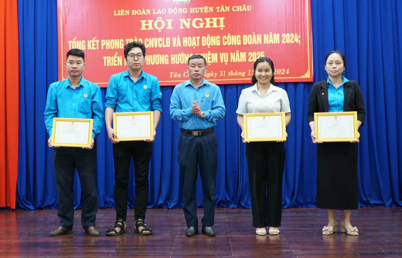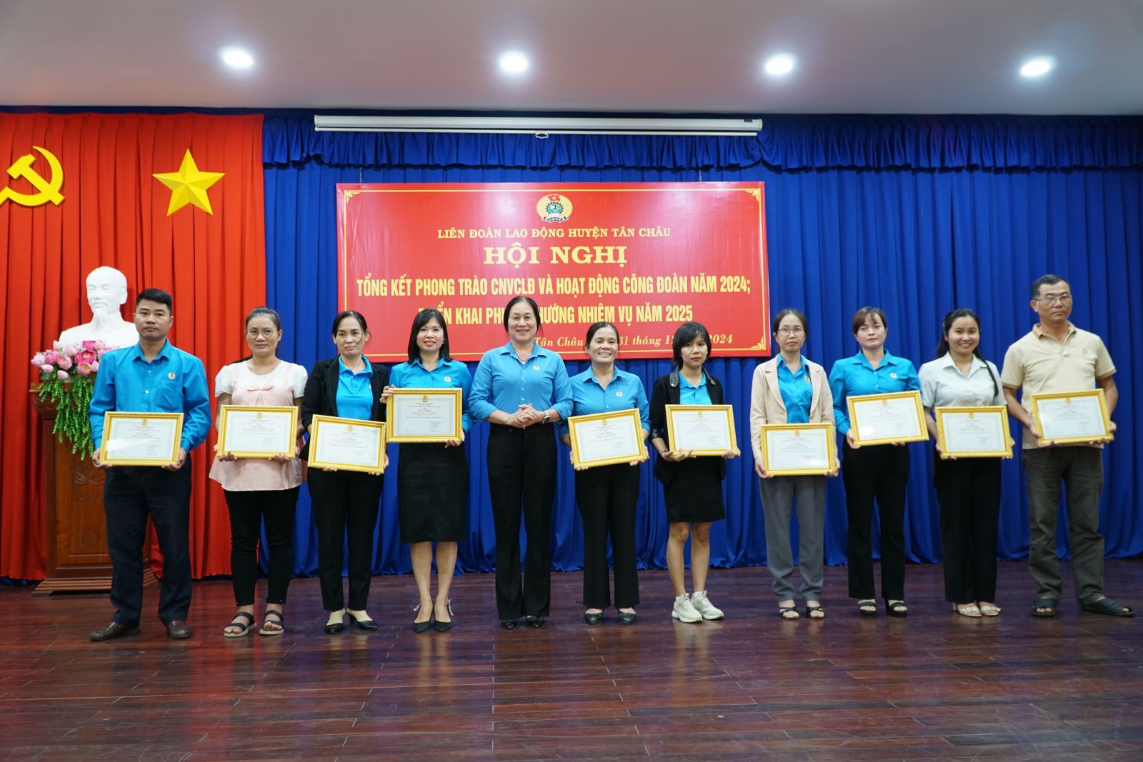 Kết quả, trong năm có 12/14 chỉ tiêu thi đua LĐLĐ huyện vượt, 2 chỉ tiêu đạt 100%. Năm 2024, LĐLĐ huyện Tân Châu hoàn thành xuất sắc nhiệm vụ, đứng hạng Nhất Khối thi đua LĐLĐ huyện, thị xã, thành phố. LĐLĐ huyện đề nghị Tổng LĐLĐ Việt Nam tặng 1 bằng khen toàn diện, 2 bằng khen chuyên đề cho các tập thể; LĐLĐ tặng cờ thi đua cho 1 tập thể, bằng khen toàn diện cho 4 tập thể và nhiều tập thể, cá nhân được LĐLĐ huyện khen thưởng.