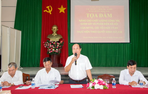 Hôm 16.10, UB.MTTQVN huyện Dương Minh Châu tổ chức buổi toạ đàm “Nâng cao chất lượng giám sát, phản biện xã hội, việc góp ý xây dựng Đảng, chính quyền của MTTQ, các tổ chức chính trị -xã hội và nhân dân trong thực hiện theo Quyết định 217, 218-QĐ/TW”.