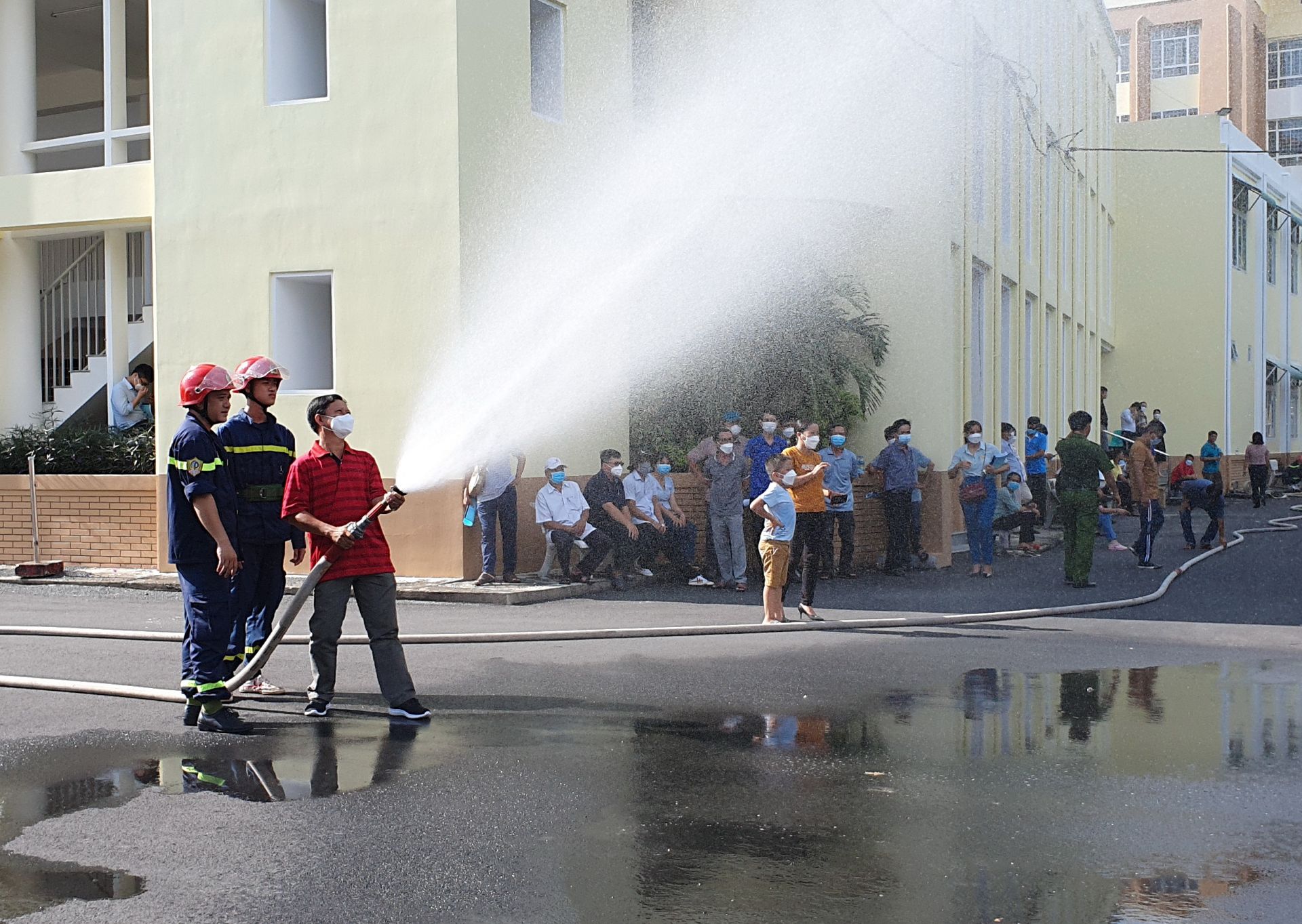 Học viên được học cách cầm vòi nước chữa cháy chuyên dụng.