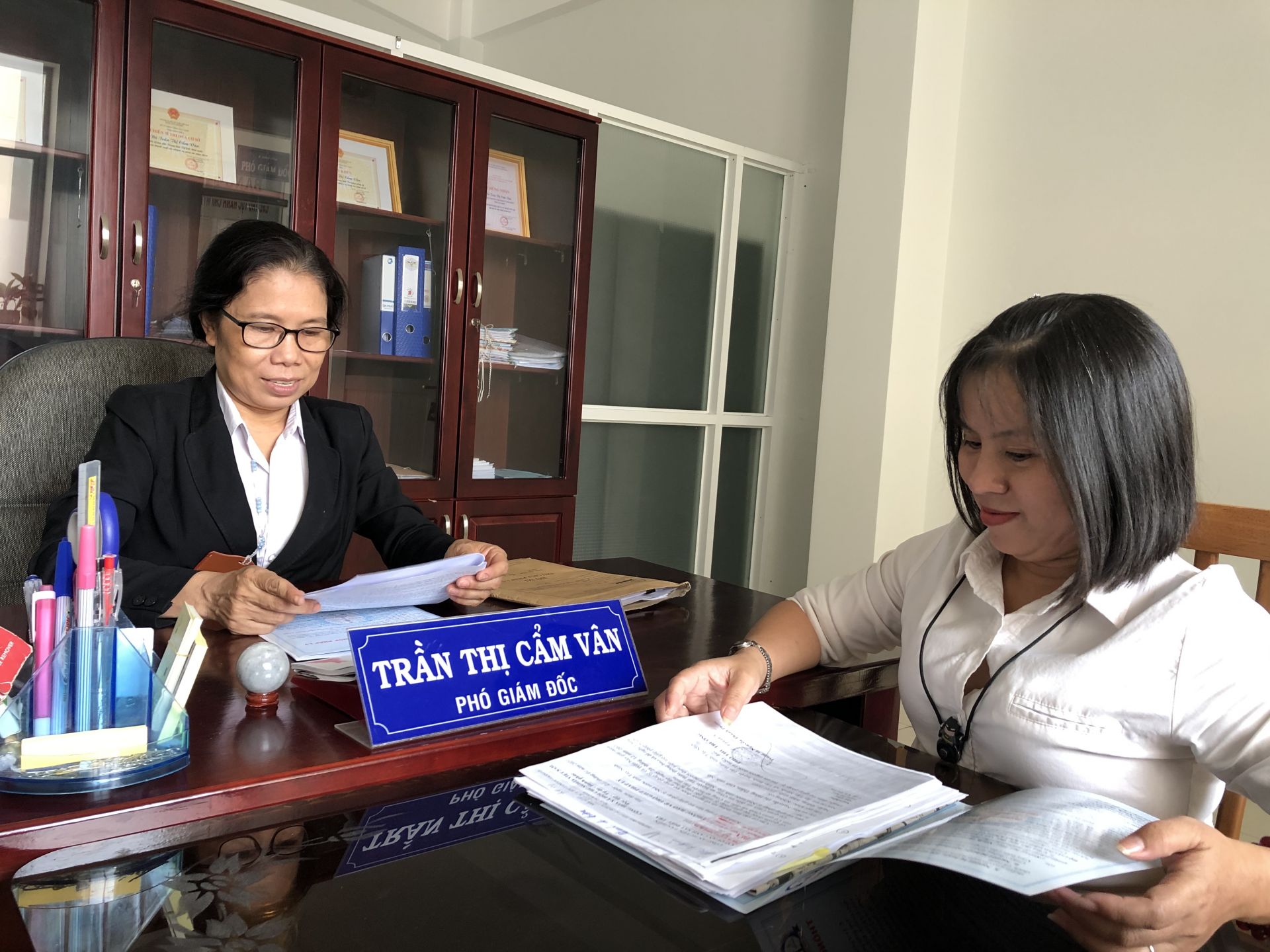 Phó Giám đốc Trung tâm TGPL nhà nước tỉnh Trần Thị Cẩm Vân (bên trái) trao đổi công việc với Trợ giúp viên pháp lý Nguyễn Thị Ngọc Linh (bên phải).