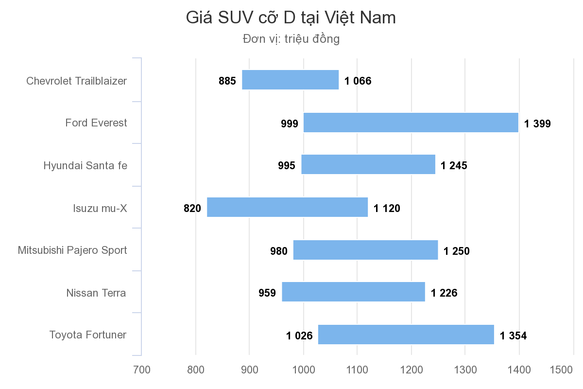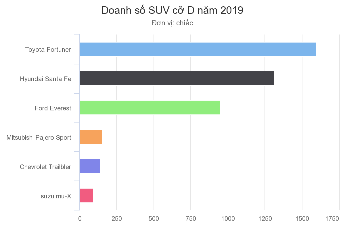Cuộc chạy đua doanh số giữa các hãng kéo theo những chương trình ưu đãi dành cho người dùng. Ở phân khúc SUV 7 chỗ cỡ D, gần như toàn bộ hãng xe cùng có sản phẩm để đánh chiếm thị phần. Chevrolet Trailblazer, Ford Everest, Isuzu mu-X, Hyundai Santa Fe, Mitsubishi Pajero Sport, Peugeot 5008 và Toyota Fortuner là những lựa chọn đang sẵn trên thị trường.