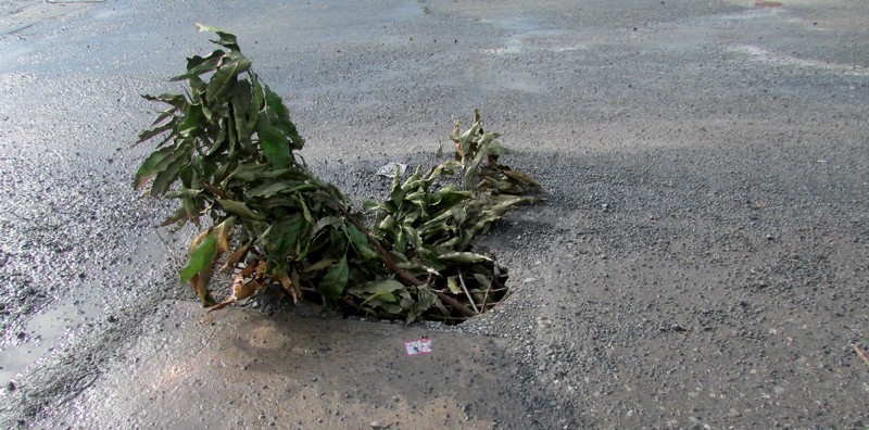 Để tránh cho người đi đường bị sụp cống, người dân địa phương lấy nhánh cây cắm lên miệng cống bị hư hỏng để cảnh báo. |