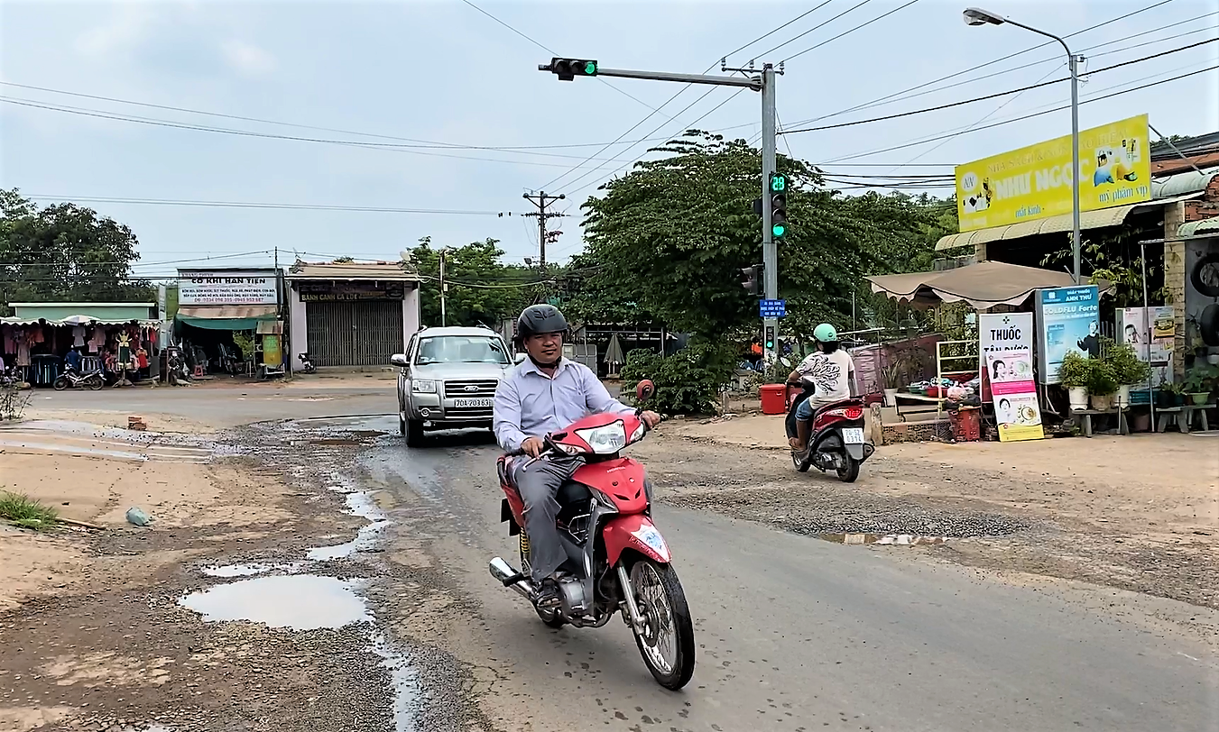 Nhiều ổ voi, bong tróc, đọng nước vào mùa khô khiến mặt đường bị thu hẹp lại.