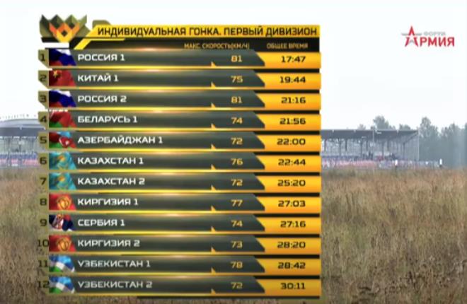 Ngày 25/8, đội tăng Russia 1 lần đầu tiên thi đấu ở nội dung "Tank Biathlon”. Kết quả chặng đua đội Russia 1 giành vị trí dẫn đầu, với thời gian 17 phút 50 giây. Đây là kỷ lục tốt nhất được xác lập được trong vòng loại "Tank Biathlon". Xếp ở các vị trí tiếp theo là Kazakhstan 1 (23 phút 15), Kyrgyzstan 1 (27 phút 04) và Uzbekistan 1 (28 phút 43).