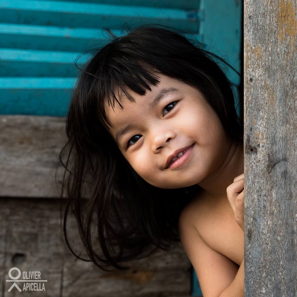 Bé gái nấp sau cửa nhà, tò mò nhìn Olivier ở Vũng Tàu, Việt Nam.
