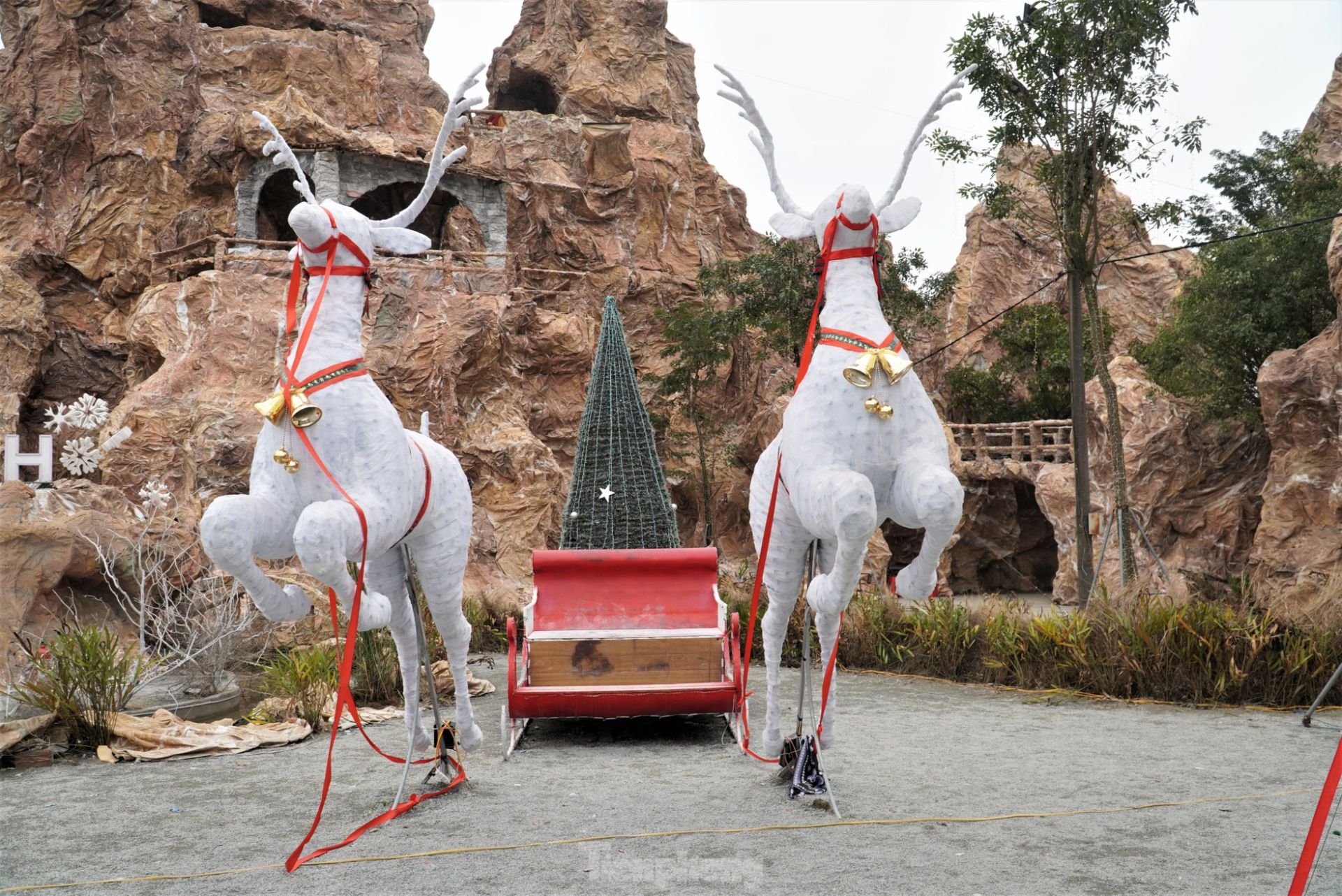 Bên ngoài hang đá được trang hoàng đèn nháy có nhiều màu sắc rực rỡ và máy phun tuyết nhân tạo khiến du khách rất thích thú.