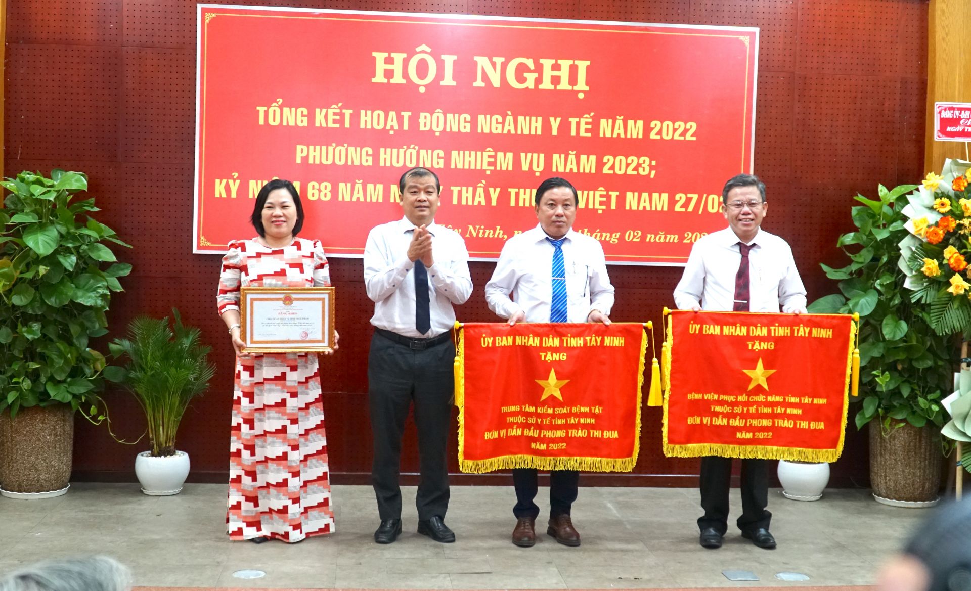 Dịp này, để ghi nhận, tôn vinh và động viên những thành tích của đội ngũ y, bác sĩ, nhân viên y tế, UBND tỉnh trao tặng Cờ thi đua cho Bệnh viện Phục hồi chức năng và Trung tâm Kiểm soát bệnh tật tỉnh có thành tích dẫn đầu phong trào thi đua năm 2022; 8 tập thể và 56 cá nhân có thành tích xuất sắc trong công tác năm 2022 được nhận Bằng khen của UBND tỉnh.