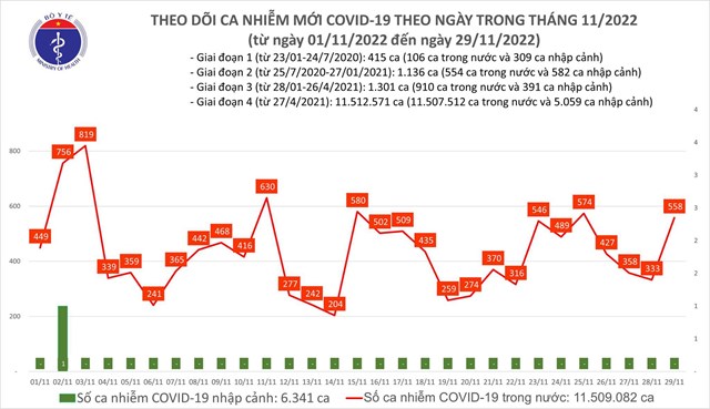 Bản tin phòng chống dịch Covid-19 của Bộ Y tế cho biết có 558 ca mắc Covid-19, tăng hơn 200 ca so với hôm qua; sau nhiều ngày không ghi nhận trường hợp tử vong, hôm nay có 2 ca tử vong tại Tây Ninh.