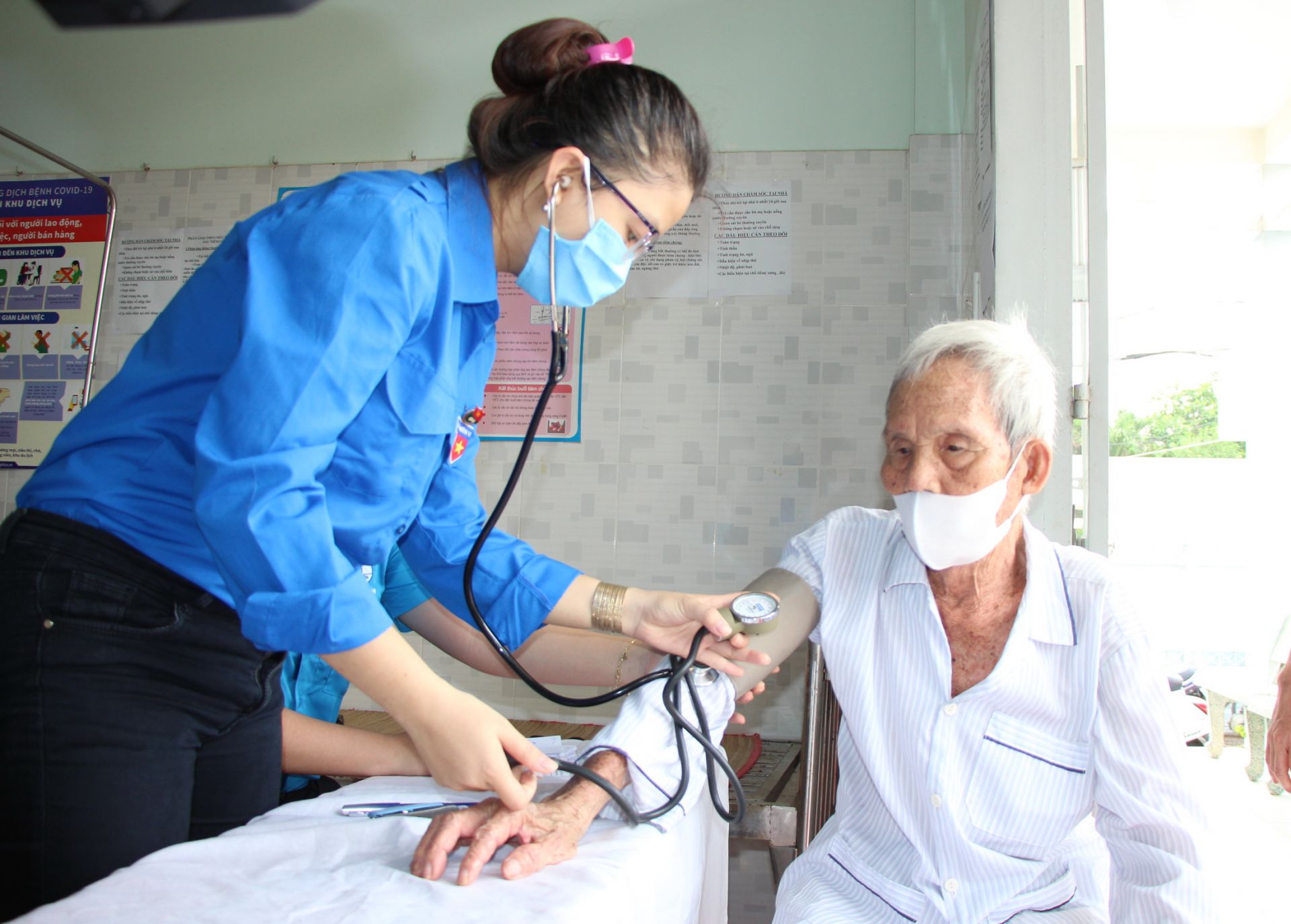 Đo huyết áp cho người cao tuổi.