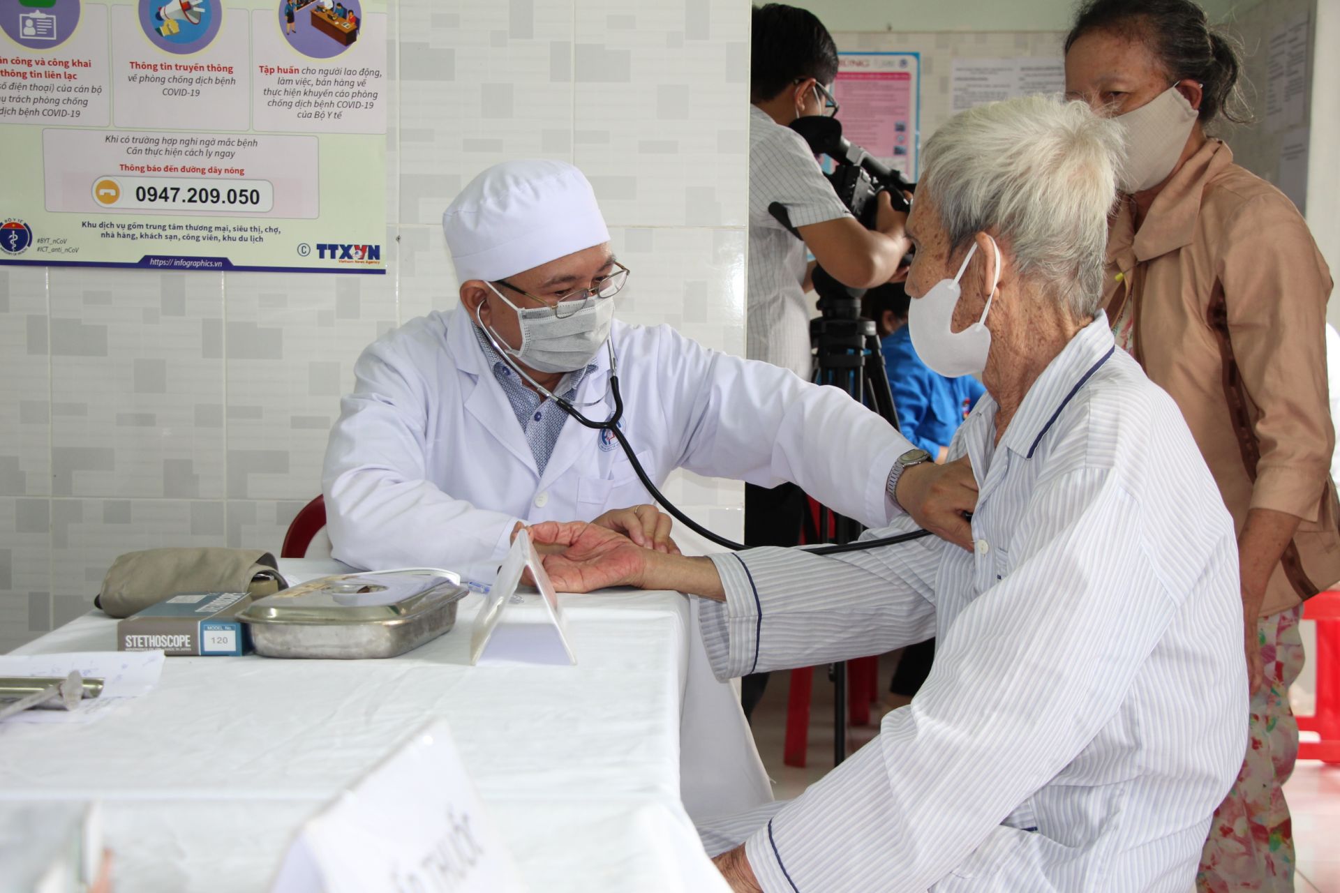 Thầy thuốc khám bệnh cho người cao tuổi.