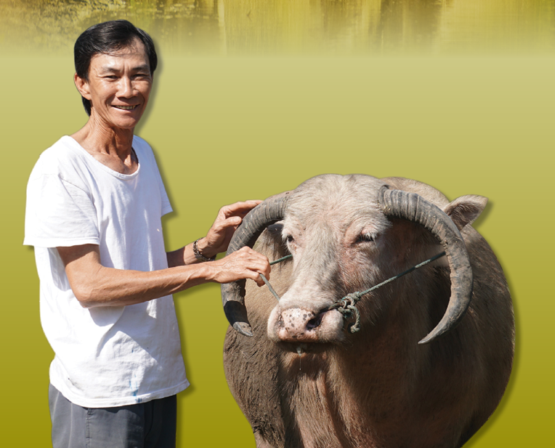 Ông Sang bên con trâu cò hiền lành của mình.