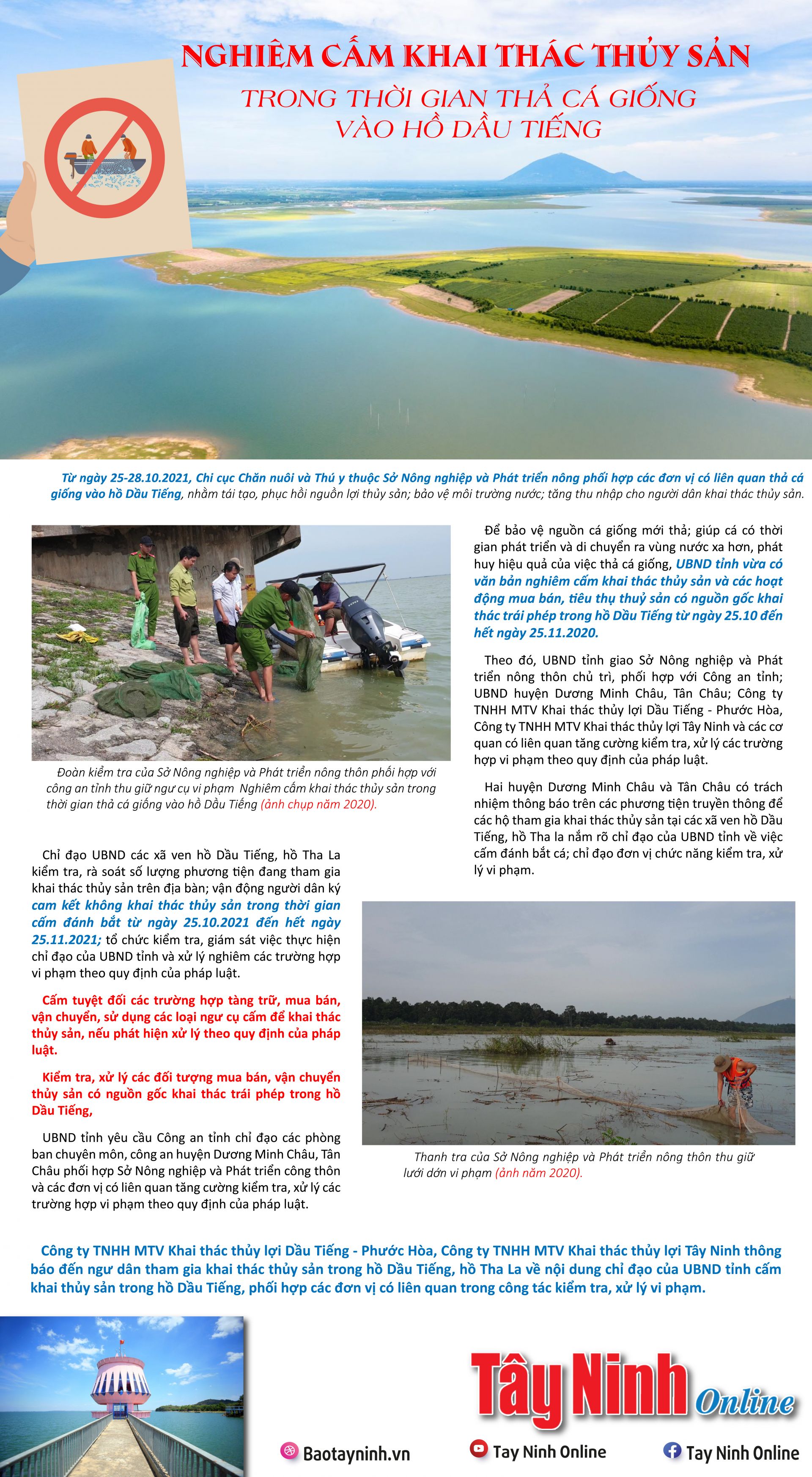 Từ ngày 25-28.10.2021, Chi cục Chăn nuôi và Thú y thuộc Sở Nông nghiệp và Phát triển nông phối hợp các đơn vị có liên quan thả cá giống vào hồ Dầu Tiếng, nhằm tái tạo, phục hồi nguồn lợi thủy sản; bảo vệ môi trường nước; tăng thu nhập cho người dân khai thác thủy sản. |