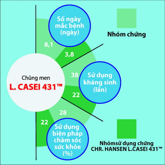 Trải qua hai năm tiến hành, nghiên cứu này đã chứng minh được việc sử dụng chủng men L. CASEI 431™ có thể giúp rút ngắn thời gian bị cảm cúm và bệnh cảm thông thường với số ngày bệnh giảm từ 8,1 ngày (đối với nhóm dùng giả dược) xuống còn 4,8 ngày; đồng thời làm giảm việc sử dụng thuốc kháng sinh từ 38 lần xuống chỉ còn 22 lần.