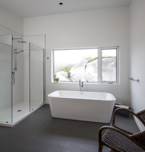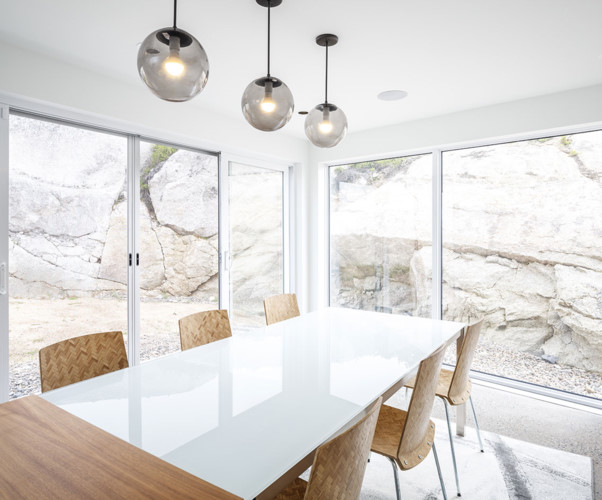 Phòng khách được thiết kế sáng với khoảng không nhìn ra toàn cảnh bên ngoài núi đá.