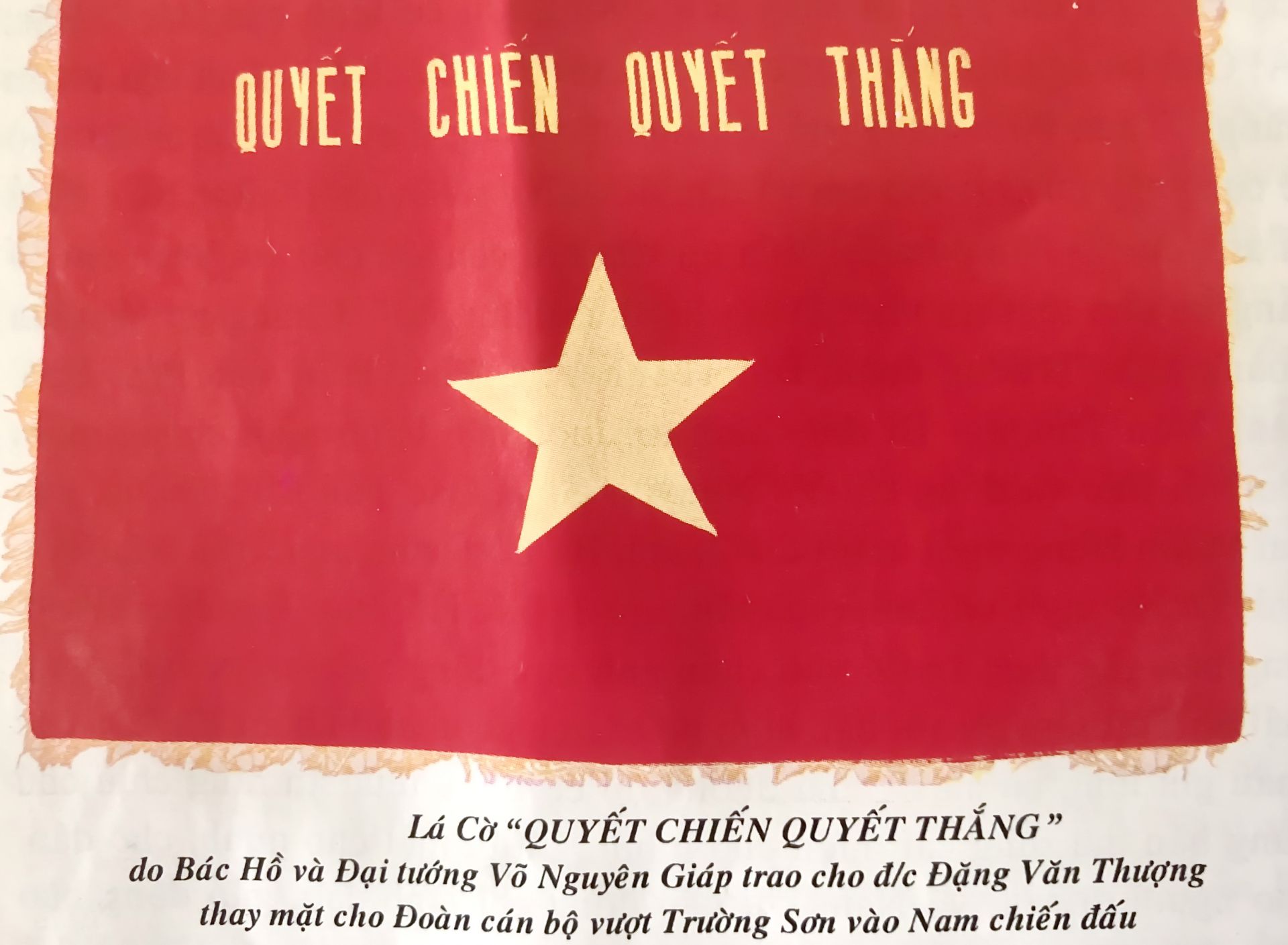 Ðồng chí Ðại tướng Võ Nguyên Giáp đưa đến bàn ăn có Bác Hồ ngồi, mở gói giấy lấy lá cờ “Quyết chiến quyết thắng” của Quân đội nhân dân Việt Nam trao cho tôi- đồng chí Ðặng Văn Thượng, và nói: “Ðồng chí là Bí thư Chi bộ, là chính trị viên, hãy giữ lá cờ này như sinh mạng chính trị của đoàn, thường xuyên mở ra xem trên đường đi để nhắc nhở nhau ý chí và quyết tâm, khi về Nam xây dựng lực lượng quân đội lấy cờ ra giáo dục anh em, đặc biệt dùng cờ này trong chiến đấu, quyết tâm tiêu diệt quân thù, giải phóng miền Nam, rước Bác về thăm”.