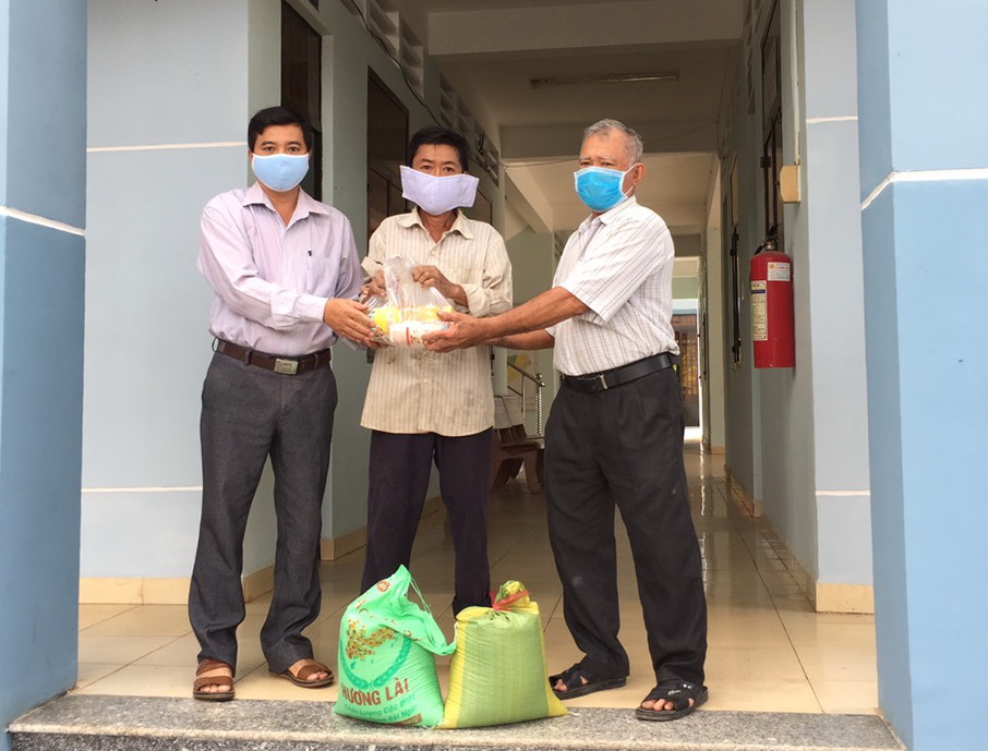Ông Lê Văn Đáng (bìa phải) và ông Lương Xuân Hà tặng quà cho người có hoàn cảnh khó khăn.