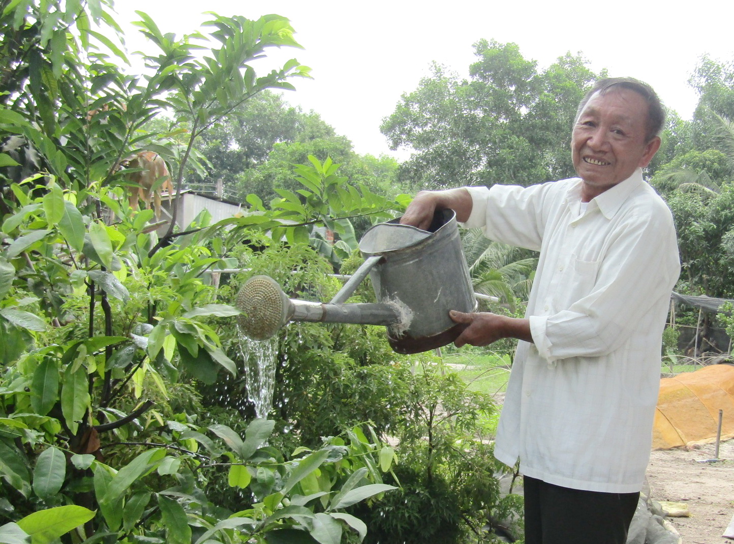 Ông Hoàn tưới cây cảnh.