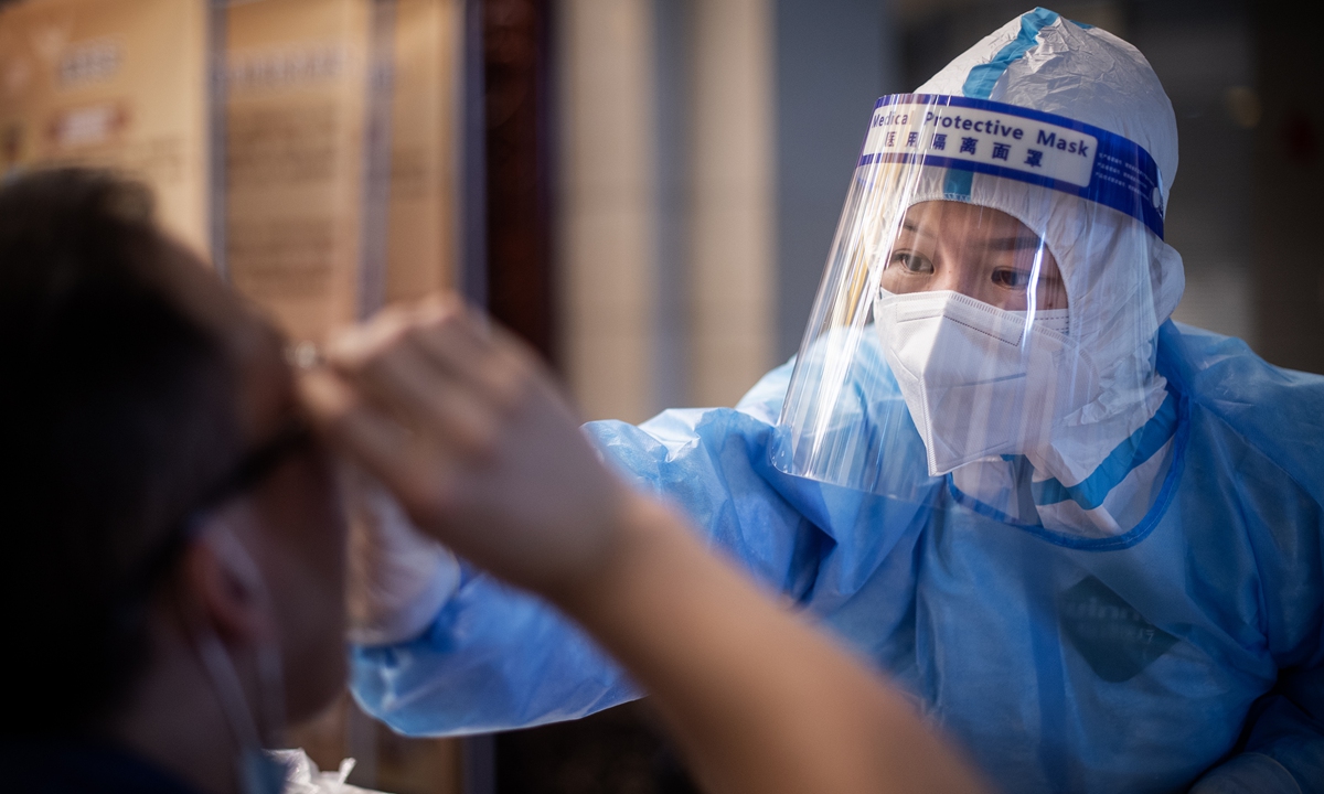 Nhân viên y tế xét nghiệm COVID-19 cho một người dân địa phương ở huyện Dongxihu, Vũ Hán, tỉnh Hồ Bắc, miền trung Trung Quốc. Ảnh: The Paper
