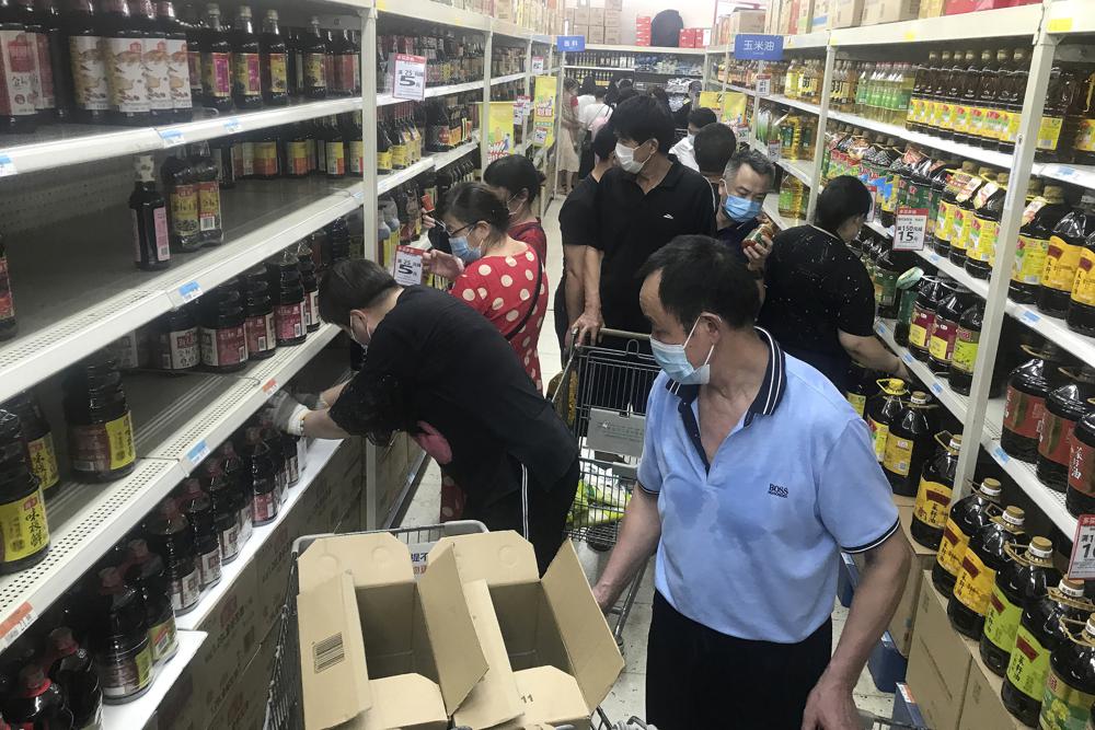 Người dân đi mua sắm nhu yếu phẩm tại một siêu thị ở thành phố Vũ Hán ngày 2/8. Ảnh: AP