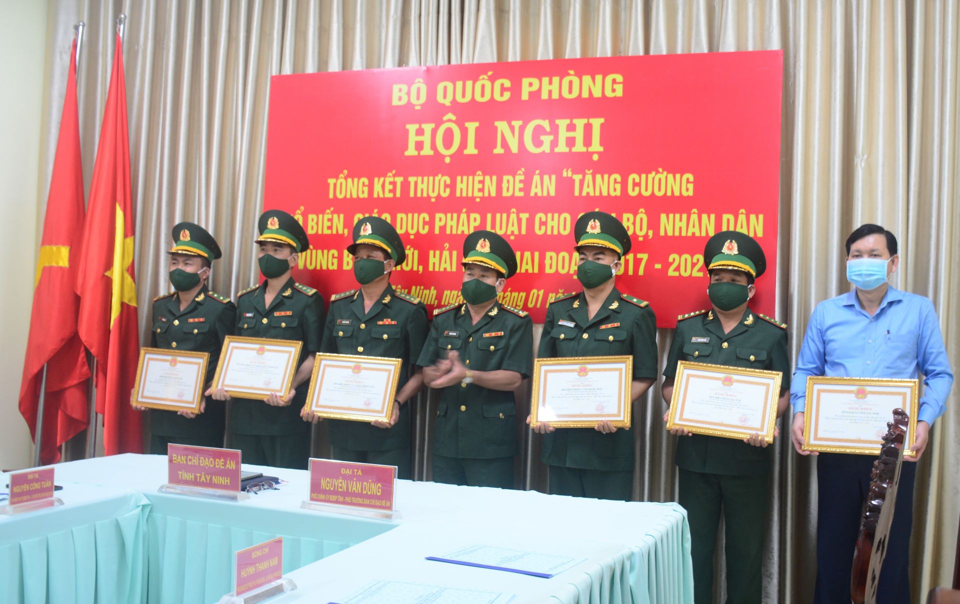 Thừa uỷ quyền của Bộ trưởng Bộ Quốc phòng, lãnh đạo BĐBP Tây Ninh trao bằng khen của Bộ cho 2 tập thể, 3 cá nhân có thành tích cao trong công tác PBGDPL vùng biên giới.