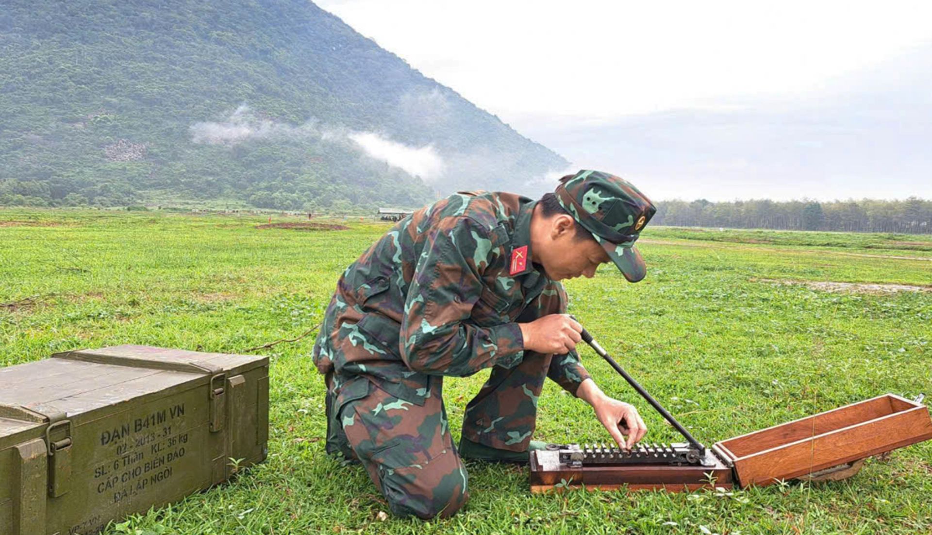 Thiếu tá Trần Đức Ý với mô hình “xử lý đạn lép”.