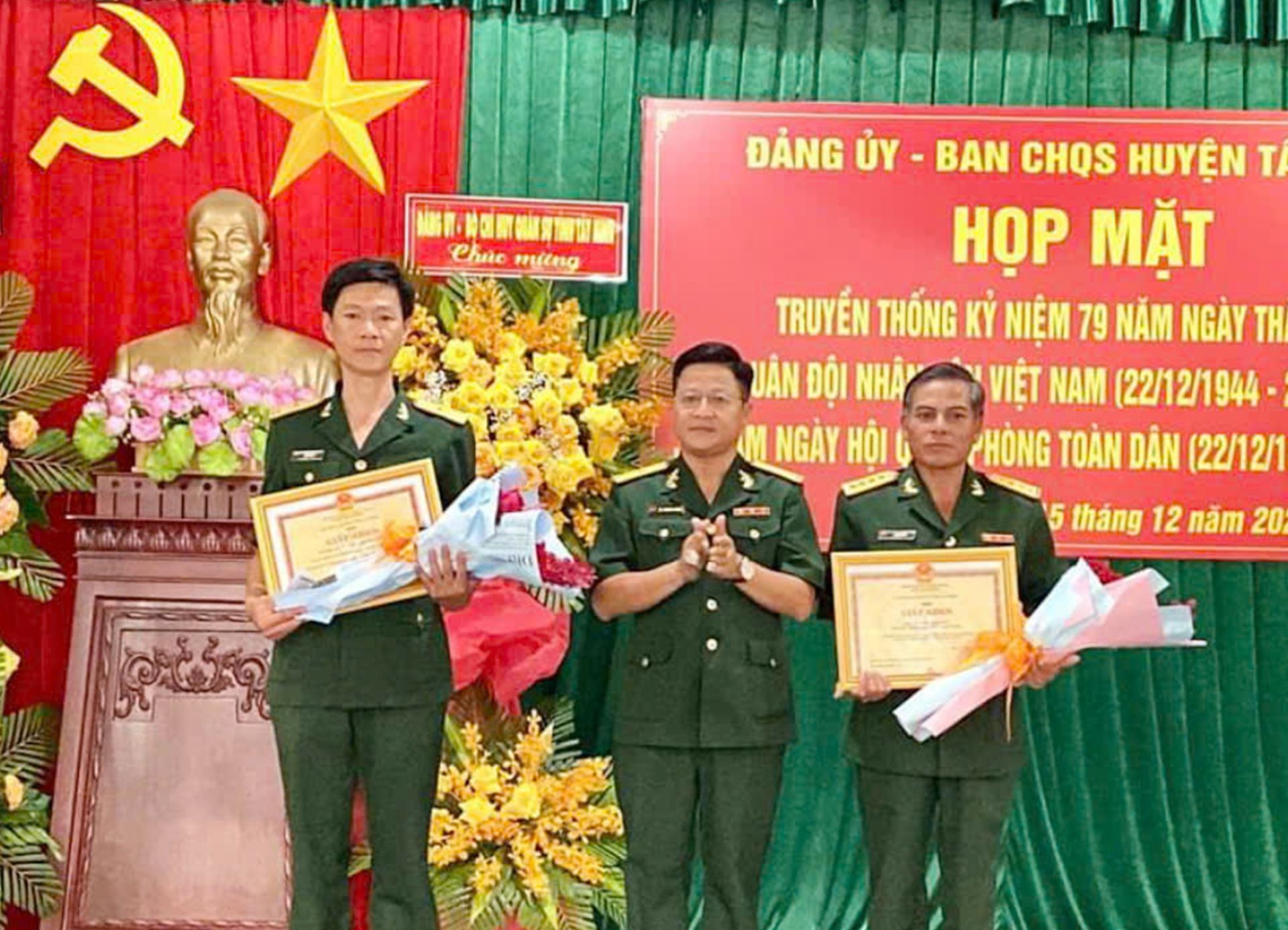 Thiếu tá Trần Đức Ý nhận giấy khen của Ban Chỉ huy Quân sự huyện Tân Biên.