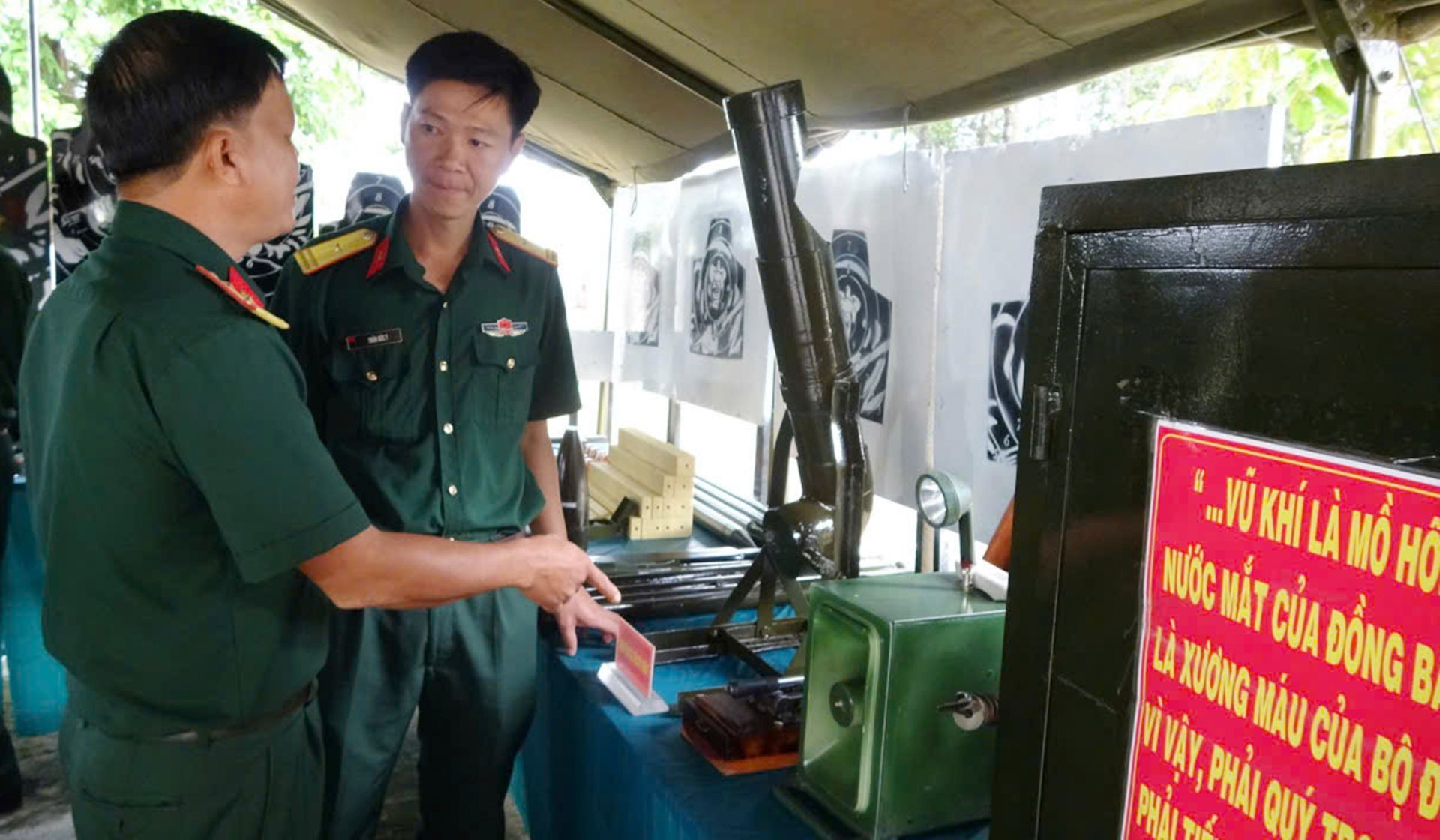 Thiếu tá Trần Đức Ý giới thiệu mô hình sản phẩm cải tiến kỹ thuật của mình.