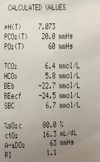 Khi vào viện, bệnh nhân đòi uống nước liên tục nhưng uống nước là nôn, đặt sonde tiểu không có nước tiểu. Xét nghiệm cho thấy bệnh nhân có nồng độ pH máu là 7,07 (ở người bình thường 7,45) HCO3- giảm còn 5,8 trong khi đó ở người bình thường là 24.