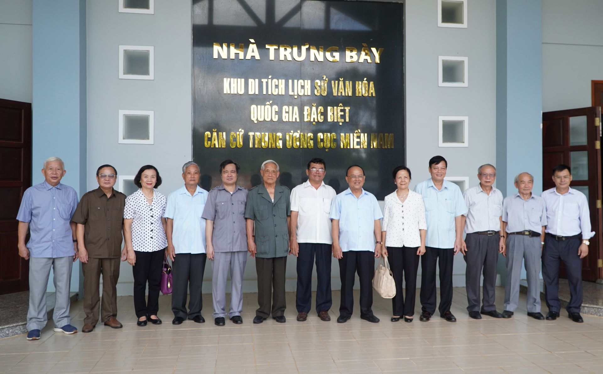 Các đại biểu chụp ảnh lưu niệm tại Nhà trưng bày Khu di tích lịch sử văn hoá quốc gia đặc biệt Căn cứ Trung ương Cục miền Nam.
